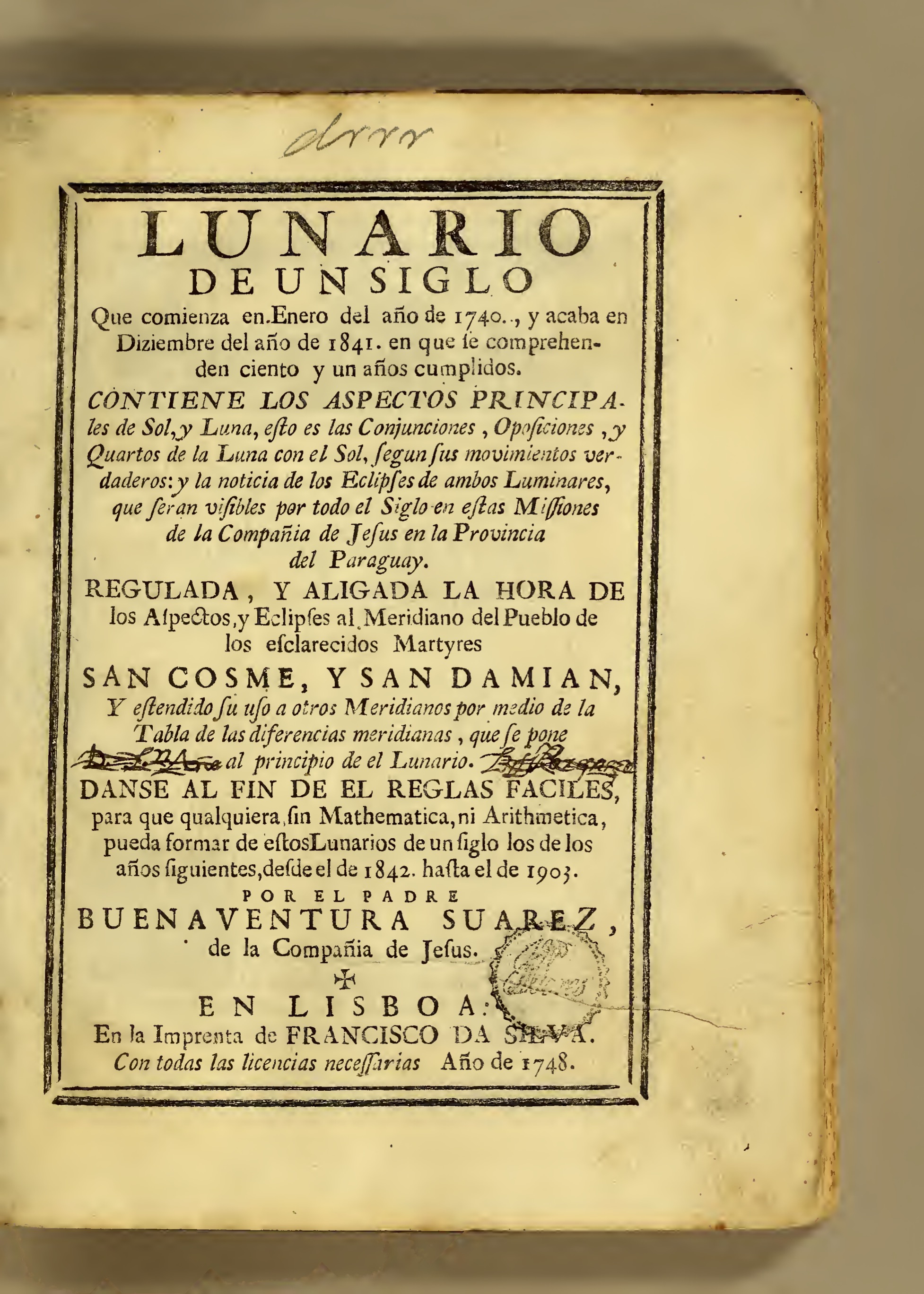 - Buenaventura Suárez (1679-1750), a Jesuit from Santa Fé (in present-day Argentina), spent most of his life as a missionary in the Río de la Plata Basin, where he composed these lunar ephemerides, published in Lisbon in 1748. This specific copy is a poignant reflection of the social structure within what would become the largest Jesuit mission in history, ultimately destroyed during the Guaraní Wars in the mid-18th century. Returning to South America, initially the copy belonged to Suárez himself, and later it was owned by Juan Sixto Mbiti, the Guaraní deputy "corregidor" of the village of San Lorenzo Mártir, in what is now Brazil. Besides having been written in Paraguay, printed in Lisbon, sent back to the author, and finally passing into the hands of a Guaraní official—knowledge in circulation in a most literal sense—the book includes a century-long lunar calendar and eclipse canon, along with the longitude differences between various major cities worldwide and the small locality of San Cosme, which effectively becomes the "center" of the world.