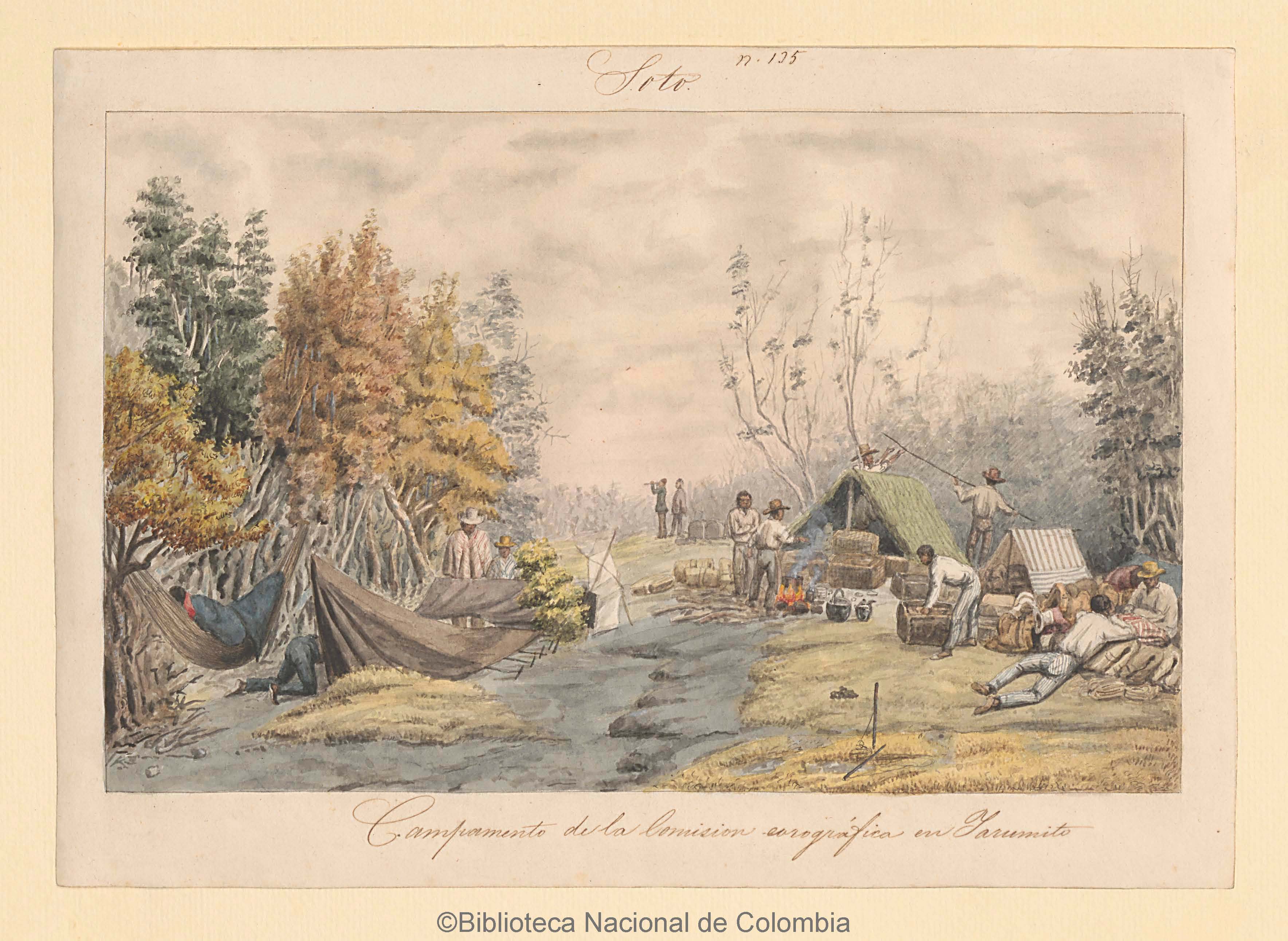 - Camp of the Chorographic Commission in Yarumito, Colombia. Author: Carmelo Fernández, 1850. Watercolor on paper, 28 x 20cm. Source: National Library of Colombia https://bibliotecanacional.gov.co/.